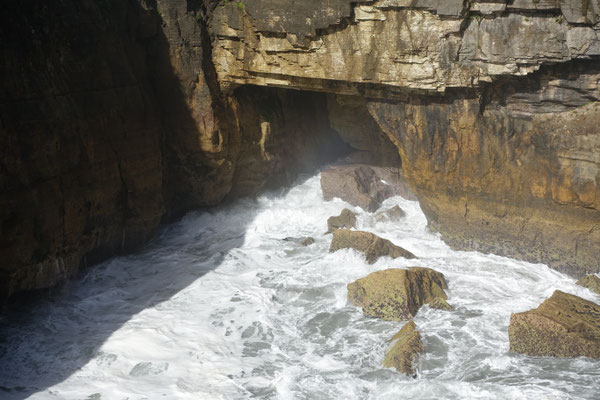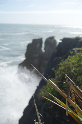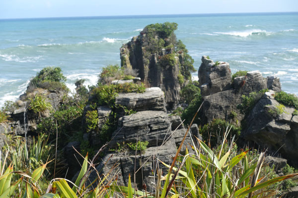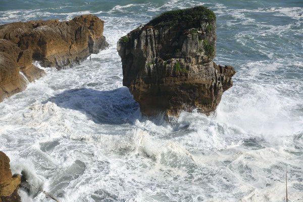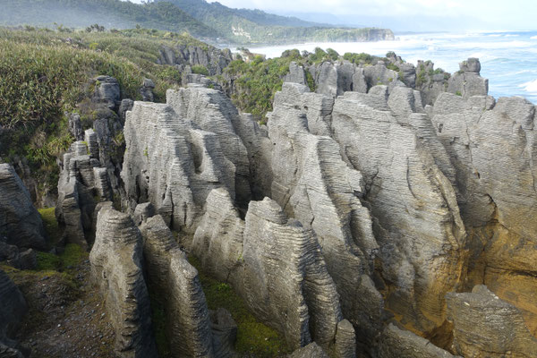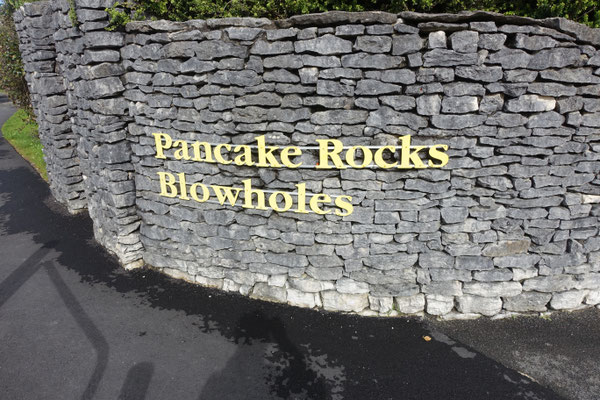 Die Pancake Rocks sind eine Felsformation direkt an der Tasmanischen See (Meer) gelegen. Die Felsen sehen aus wie übereinander geschichtete Eierkuchen, daher auch der Name. Entstanden sind diese Felsen vor 30 Millionen Jahren durch übereinander geschichtet Ablagerungen von Kalksedimenten und Tonmineralien, die unterschiedlich schnell erodieren. Durch eine Landhebung sind diese Ablagerungen an die Oberfläche gehoben worden. Durch die Wellen, Wind und Regen werden sie langsam abgetragen. Das Wasser der Brandung bricht sich an den zahlreichen Felsnasen, in Höhlen und Ausspülungen und drückt zurückfließendes Wasser und durchströmende Luft durch enge Löcher und Röhren, was oberhalb der Felsen als sogenannte Blowholes sicht- und hörbar wird. Ein, zwei Bilder sind mir davon gelungen.