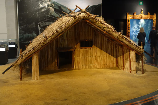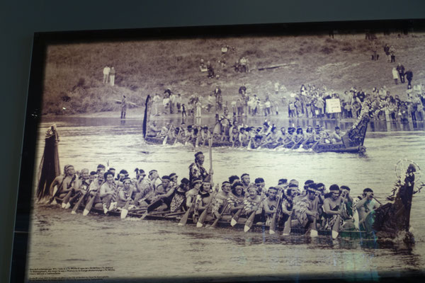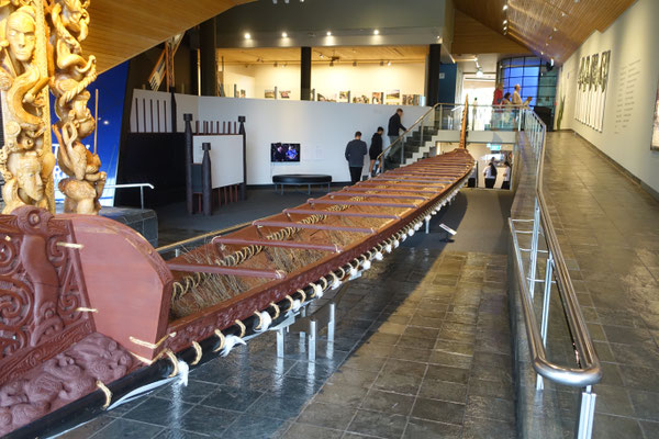 Ein erstes Highlight im Museum ist ein Waka Kriegskanu mit einer Länge von 30 Metern mit Platz für bis zu 100 Kriegern. Das Boot ist aus einem Stück Baumstamm gearbeitet worden.