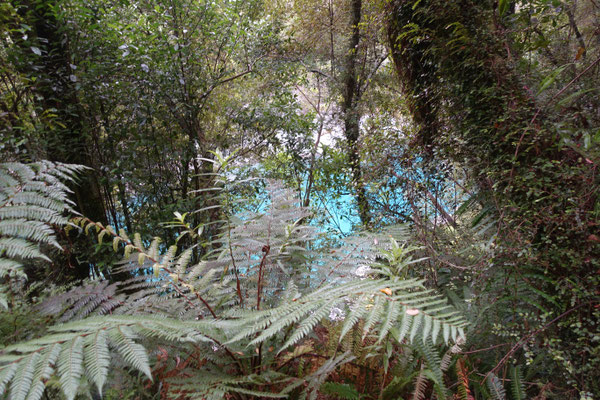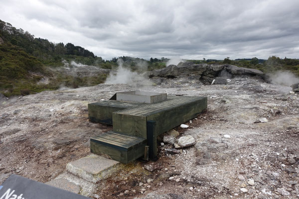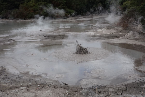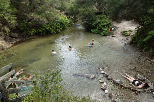 und die heißen Quellen im Waiotapu Reservat an. Da mussten wir natürlich unbedingt einmal von der Strasse ab in den Urwald biegen und es uns anschauen. Unglaublich was man zu sehen bekommt. Das Wasser hat übrigens Badewassertemperatur und wird wie man sehen kann, gerne zum entspannen genutzt. Leider hatten wir den Rotwein, den Käse und das Brot nicht dabei um einen gelungene längere Pause zu machen. Aber auch so war es sehr beeindruckend.