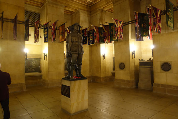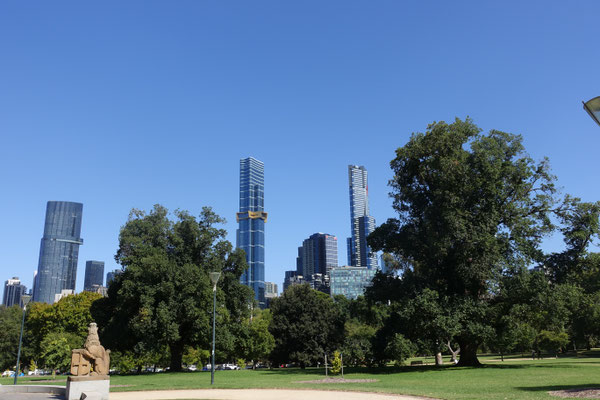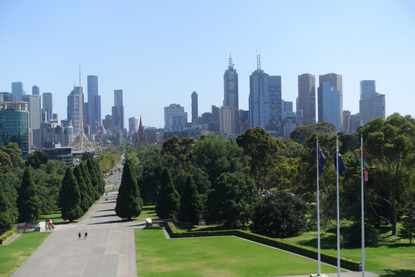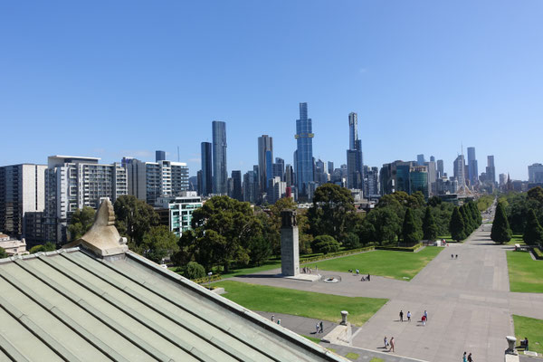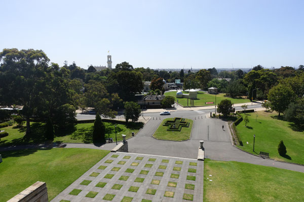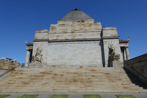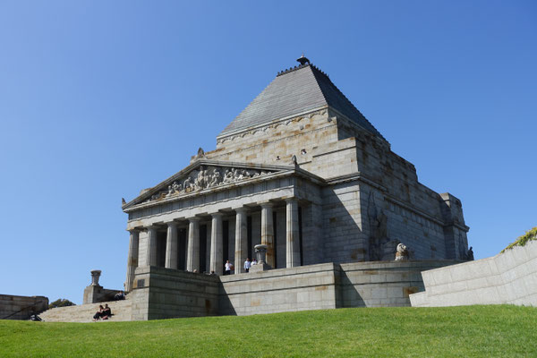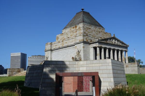 Im Anschluss von Kings Domain kommt man an den Shrine of Remembrance (Schrein der Erinnerung an die in vielen Kriegen gefallenen Soldaten) Ein sehr beeindruckendes Gebäude, das in seinem Bau und Innenleben einer Pyramide ähnlich ist. Der Schrein wurde nach einer Bauzeit von 7 Jahren, 1934 feierlich eröffnet. In den zurückliegenden Jahren wurden einige Denkmäler für diverse Kriege, wie den 2. Weltkrieg, im Außenbereich aufgestellt. Der Schrein verfügt in seiner Mitte über einen Aussenbalkon, von dem man einen tollen Blick auf die Grünanlagen und