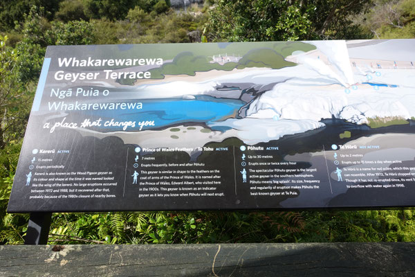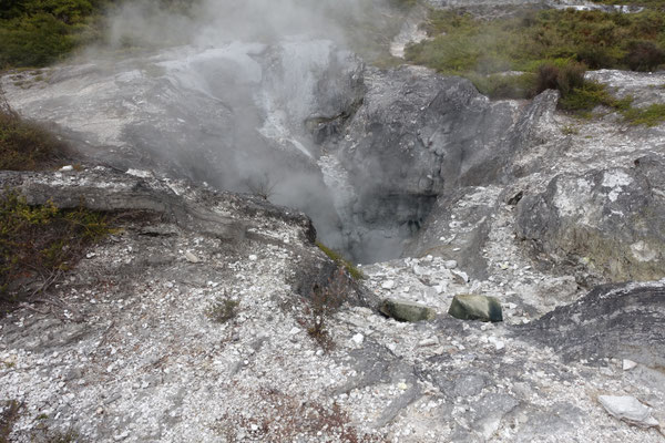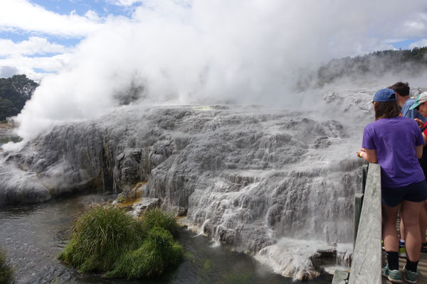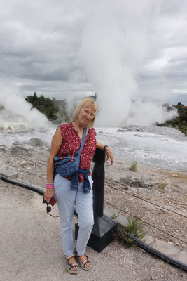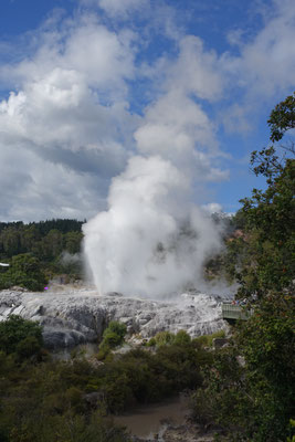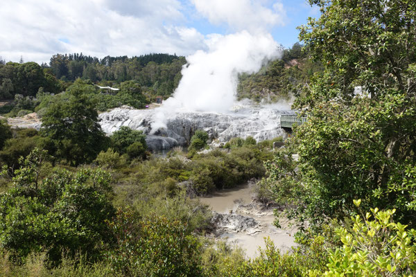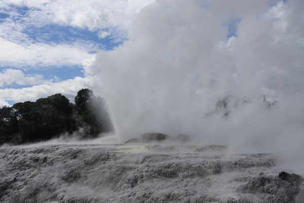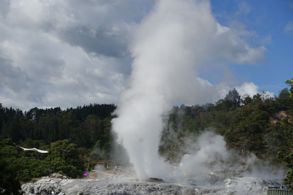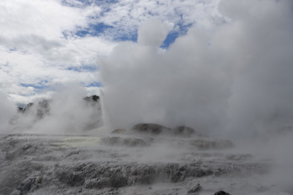 Im Anschluss kommt und natürlich von weitem schon zu sehen und zu riechen der Geysir Pohutu, welcher der größte Geysir der südlichen Halbkugel ist. Der Geysir ist fast immer aktiv und produziert eine bis zu 30 mtr. hohe Fontäne. In dieser berühmten Geothermalzone befinden sich rund 500 Geysire auf einer Fläche von 60 Hektar.