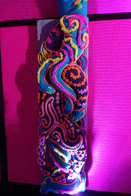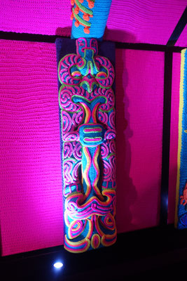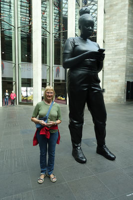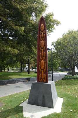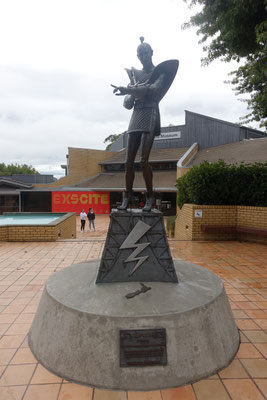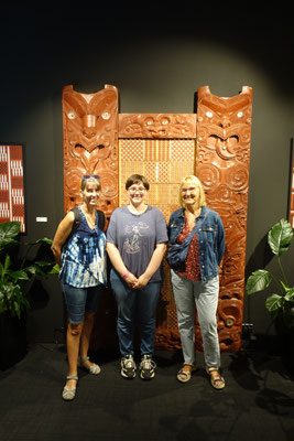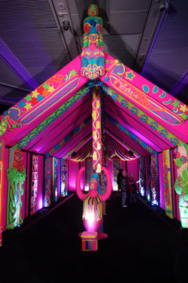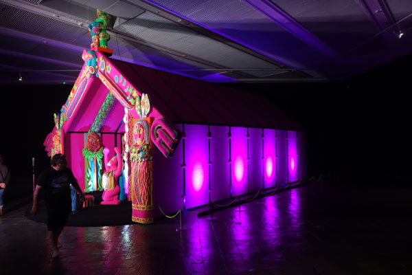 Ein zweites Highlight fanden wir im 2. Stock. Dort ist ein Maori Haus (House of Joy) von dem Künstlerehepaar Lissy Robinson-Cole (Ngati Hine) und Rudi Robinson-Cole (Nga Ruahine) ganz aus Wolle gehäkelt ausgestellt. Unglaublich, was man dort zu sehen bekommt. Alle Pfosten und auch die Seitenwände sowie die Rückwand sind mit gehäkelten Figuren versehen. Alle haben natürlich eine Bedeutung für die Künstler. Sie einzeln zu beschreiben würde hier zu viel Raum einnehmen. Wir bringen ein Prospekt darüber mit. Fast hätte ich es vergessen. Vor dem Eingang zum Museum steht die Riff-Raff Statue aus dem Kultmusical "Rocky Horror Picture Show". Der Schöpfer ist Richard O`Brien, der in Hamilton gearbeitet hat.