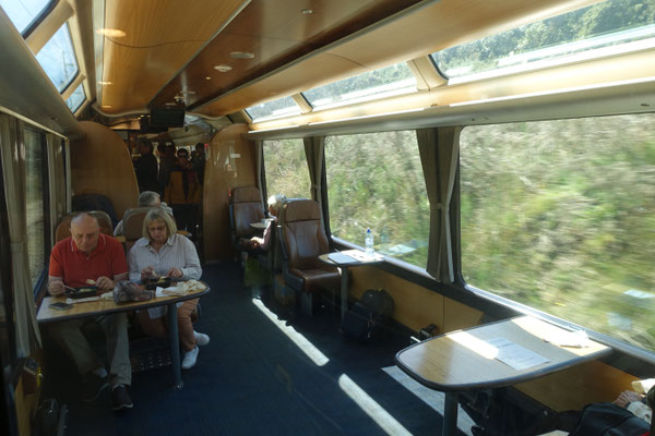Der Zug besteht ganz aus Panoramawaggons, mit einem Bistrowaggon und einem zusätzlichen Aussichtswaggon, der ohne Fensterscheiben auskommt. Dort treffen sich die vielen Foto- und Videomacher auf der Fahrt. Auch ich habe dort einige Zeit verbracht und Bilder gemacht. Man wird ziemlich durchgeblasen und in der Höhe ist es ganz schön frisch.