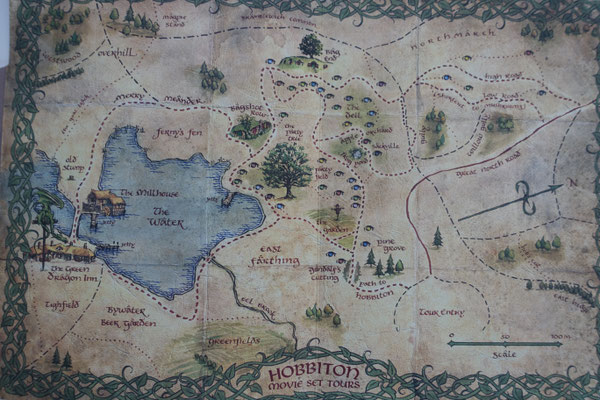heute noch von vielen fleissigen Händen gepflegt und Instand gehalten werden. Zum Abschluss der Tour ging es über die Brücke und an der Mühle vorbei zum Green Dragon Inn. Auf dem allerersten Bild sehen wir Hobbiton auf einer alten Karte im Gesamten dargestellt. Viel Spaß beim Bilder schauen..